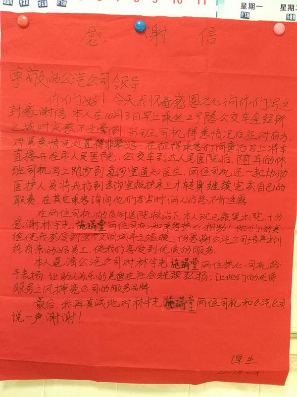 10月14日,陈伯两夫妻将一面写有“热心相助 弘扬美德”的锦旗,交到了江门市公共汽车有限公司驾驶员林宇光、施瑞堂的手中,感谢他们热心救助陈伯的义举。