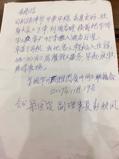表扬信由美国华州西雅图广州同乡联谊会会长梁先生和副理事长彭先生联名撰写。信中高度评价市汽运集团公司开平汽车总站驾驶员张伟华,赞扬他驾车安全平稳,态度热情有礼,沿途主动照顾年迈的嘉宾上下车,并亲自帮助乘车嘉宾把行李送至下塌的酒店。张伟华高度的责任心和诚恳服务态度得到嘉宾的高度赞誉,也向参加本次盛会的世界广府人展现了江门汽运人的风采。