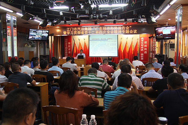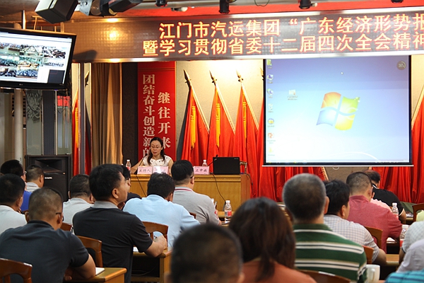 为深入贯彻落实党的十九大和习近平总书记重要讲话精神,全面准确把握当前经济形势,深刻领会省委十二届四次全会的决策部署,以新担当新作为推动当前各项工作,2018年7月6日上午,江门市汽运集团党委举办广东经济形势报告会暨学习贯彻省委十二届四次全会精神专题会议。考虑基层党组织“点多面广、地域分散”的实际情况,会议采用视频会议形式召开,汽运集团在公司本部设立主会场,属下各基层单位共设立八个分会场。会议由汽运集团党委副书记冯洁文同志主持,江门市学习“习近平总书记重要讲话精神”讲师团、广东经济形势宣讲团成员、市委党校经济教研室卫中旗副教授应邀到场作专题报告,共490多名党员、干部职工参加会议。