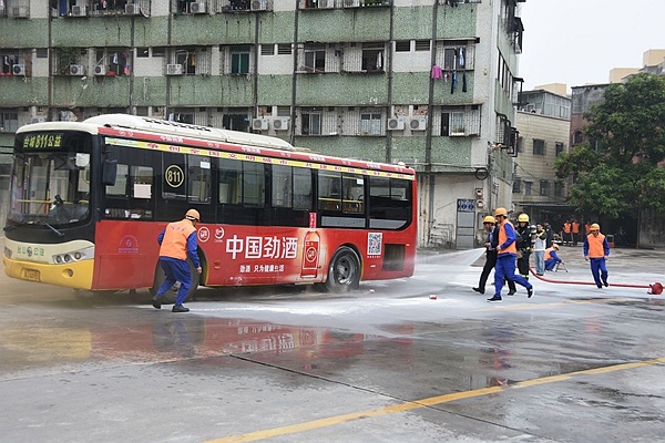 演练内容是模拟台山汽车总站两名值班人员发现停在站场内的一辆大客车车尾冒烟,随时有发生爆炸或牵连周边停放车辆着火等危险。值班人员马上就近使用站场灭火器进行灭火,同时用手机拨打119报警并逐级上报到单位应急救援指挥部。指挥部接到报告后下达指令,由灭火救援组马上对失火车辆进行灭火,由站场疏散组调派司机有序将周边大客车驶离站场。