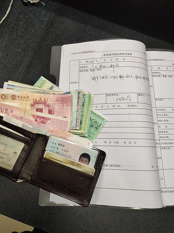 据了解,当天下午19时许,新会汽车总站驾驶员陈权套师傅到站清扫卫生时发现座椅上有一个钱包。考虑到旅客发现后肯定会心急如焚,陈师傅立刻将钱包交到问讯处登记。经清点,里面装有人民币224元、葡币2670元、身份证等。大约15分钟后,失主林先生前来问讯处找寻,当失而复得的钱包出现在眼前时,林先生都十分激动,连声说:“真是太感谢司机了!”