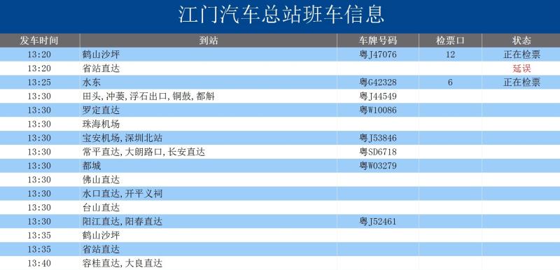 据了解,该播报显示系统连接江门总站检票口电视屏幕,通过读取后台客运数据,以实时滚动播放的形式,显示当前时间段附近的班车状态信息。此项创新举措,为旅客提供了“机场式”信息服务,使旅客能及时了解和掌握自己乘坐班车的报班状况、车号等动态信息,大大提升了旅客出行体验。
