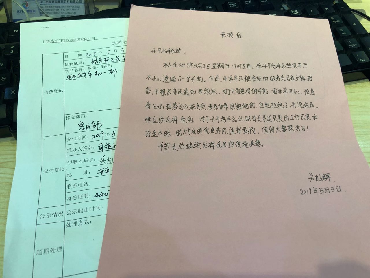 事情发生在当天下午19:20时,前来送朋友坐车的关先生一时大意将手机遗漏在开平汽车总站3号检票口的座椅上,服务员司徒小梅发现手机后,立即上报总站保卫科,并根据手机联系人通知关先生前往车站领取。接过失而复得的手机,关先生非常感激,握住服务员司徒小梅的手不停说着:“幸好有你”,还从钱包中掏出100元递给服务员表示感谢,但司徒小梅婉拒了。最后,关先生还是托人向该站送来了一封表扬信,对服务员司徒小梅表示感谢。