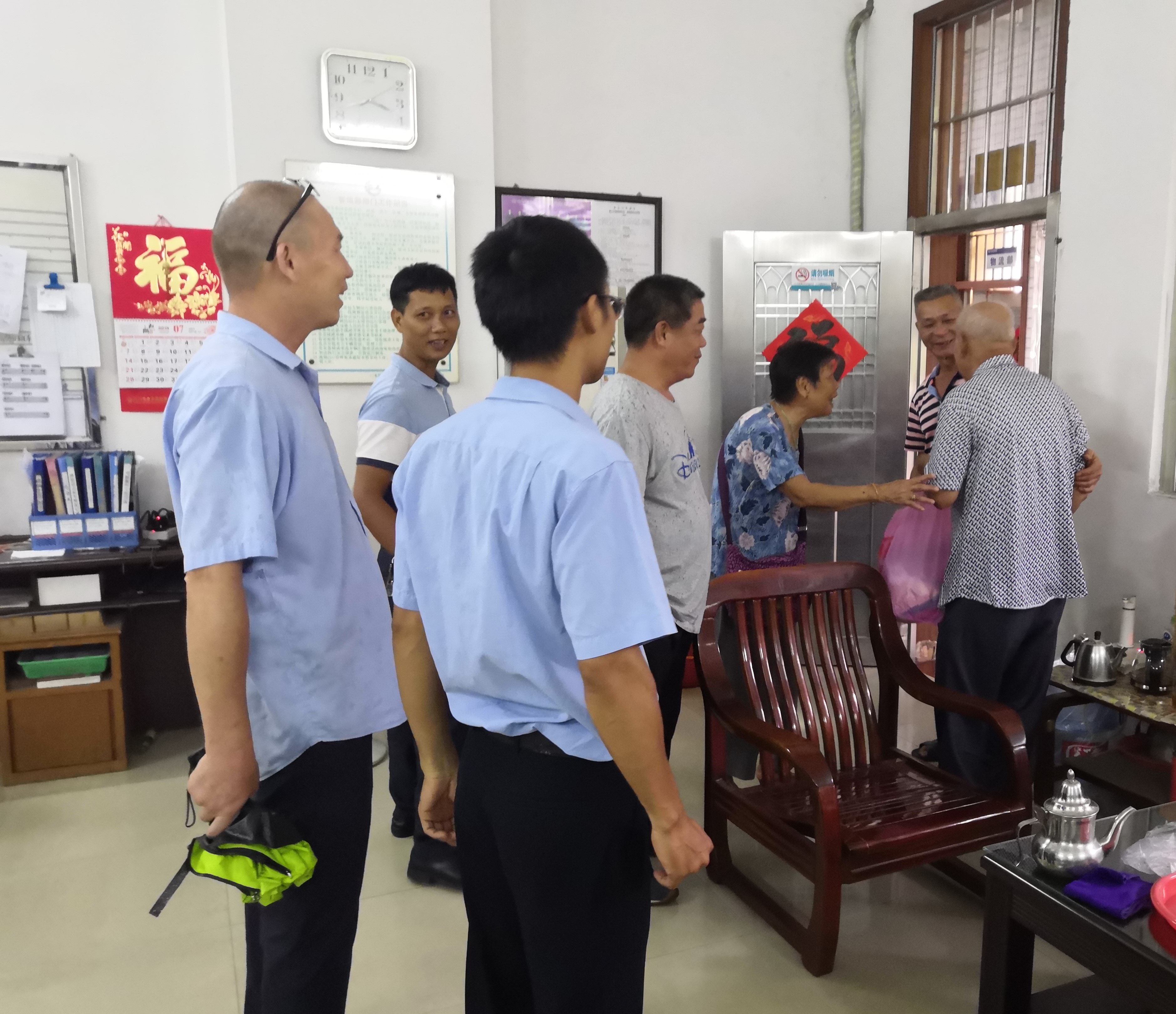 据了解,7月19日13时许,客运管理员周朝胜接到通知,一名老年男子乘坐拱北直达班车回到车站后不愿下车,且目光呆滞,语无伦次。周朝胜一边耐心向老人询问家人电话号码,一边安排同事为老人买来汤粉充饥,老人经过短暂休息才说出“古井管咀”。为了帮助老人找回亲人,周朝胜马上拨打电话到管咀村委会核实情况。管咀村委会工作人员高度重视,立刻陪同老人的妻子到车站接老人,还通知在车站工作的村民林泽明到客运办公室陪同照顾老人。