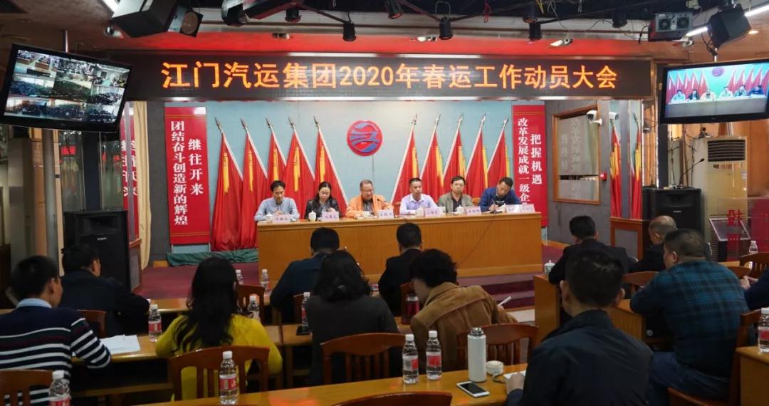 2020年春运期从1月10日开始至2月18日结束,历时40天。为切实做好春运工作,江汽运集团于12月26日组织召开了2020年春运工作动员大会(视频会议)。江汽运集团会议中心为主会场,属下各汽车总站、江门公汽公司设分会场,春运工作领导小组成员,包括江汽运集团领导班子、各部门负责人以及属下单位各层级领导干部200多人参加了会议,会议由党委委员、副总经理李潮元主持。会议传达了全国、全省春运电视电话会议以及2020年江门市春运工作动员部署会议的精神。