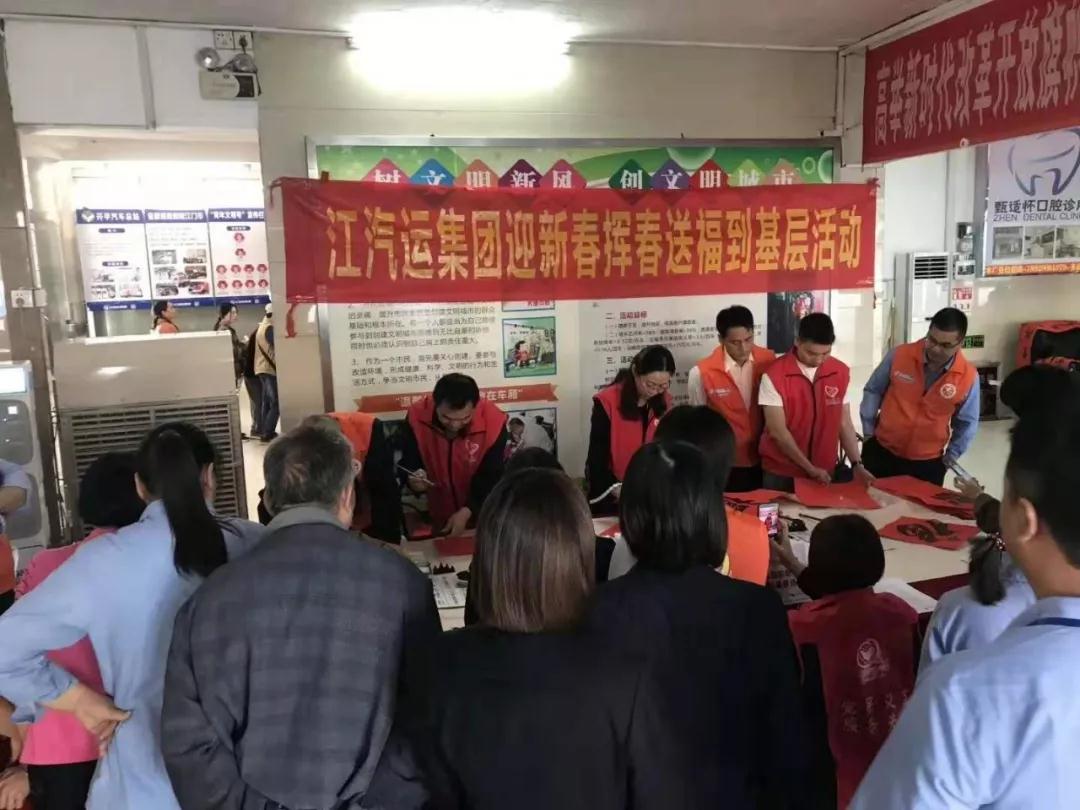据悉,本次"迎新春挥春送福"活动在江汽运集团本部及下属八大单位共开展了9场,送出对联1300余副,福字1000余张,各单位员工对活动反映热烈,不少员工在挥春开始前就已经开始排队等候,有些来得稍晚些的甚至等待两、三个小时才拿到书法家撰写的对联。还有不少到车站乘车的返乡旅客也挤到挥春区请书法家为其书写春联,要把大红的春联和福字带回家乡。