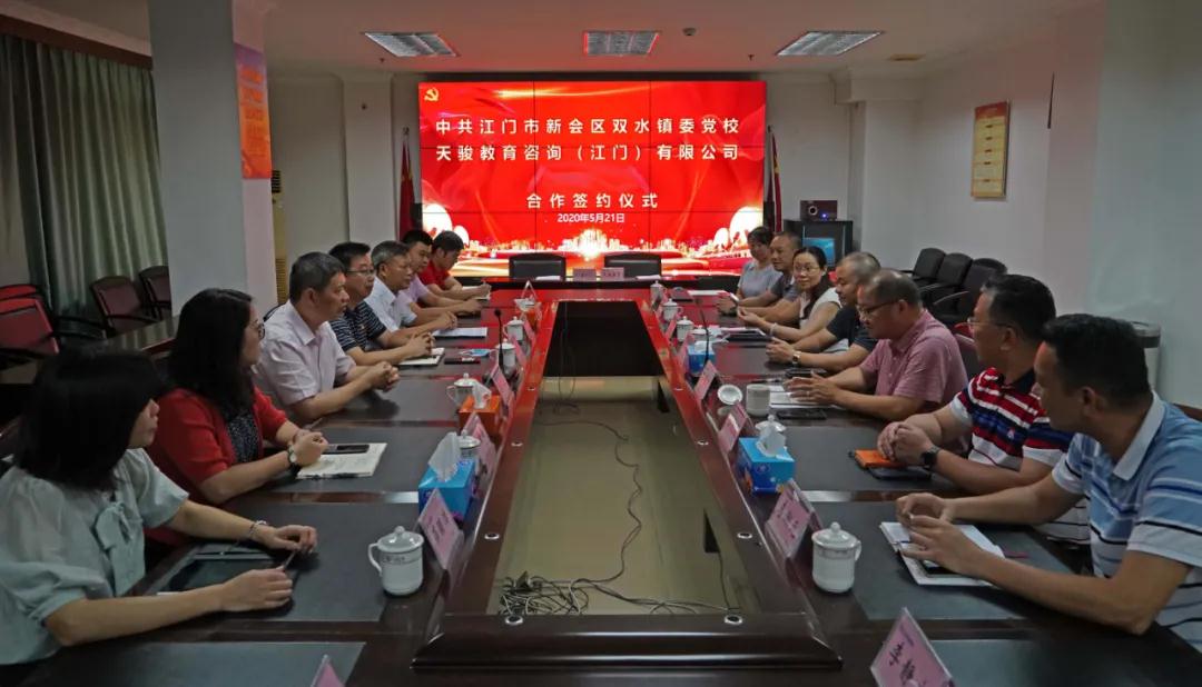 5月21日,中共江门市新会区双水镇委党校与天骏教育合作协议签约仪式在江门汽运集团9楼会议室举行。江门市委组织部副部长、市“两新”组织党工委书记张学东,新会区委组织部副部长梁志成、中共新会区委党校副校长黄金杏、新会区双水镇委副书记崔泽南、新会区双水镇党委委员薛颖洁以及江门汽运集团党委书记、董事长吕俊杰,江门兰德经济管理咨询中心总经理、天骏教育总经理吕伟波,江门市春秋国际旅行社有限公司总经理黎兆焜、江门汽运集团党委副书记冯洁文,副总经理、天骏教育董事长李潮元等出席了会议。