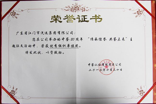 在征文活动中,广大员工踊跃投稿,讲述自己在企业推行ISO质量管理的轶闻趣事、情感故事、随想杂感及对中鉴文化的理解。集团公司荣获“优秀组织单位奖”,在中鉴认证公司一万多个客户企业当中,我公司员工投稿量最多,其中开平汽车总站司徒小红《斗转星移二十载,传承信誉鉴未来——中鉴认证有限责任公司成立二十周年有感》、邱淑侠《年的二十年,我们的十年——中鉴认证有限责任公司成立二十周年有感》、谭俊杰《中鉴公司,感谢一路相随》、梁冬仪《浅谈质量体系在运输企业的作用》以及恩平汽车总站罗吉芳《一路走来》等作品入选《中鉴认证20周年庆征文汇编》。(办公室)