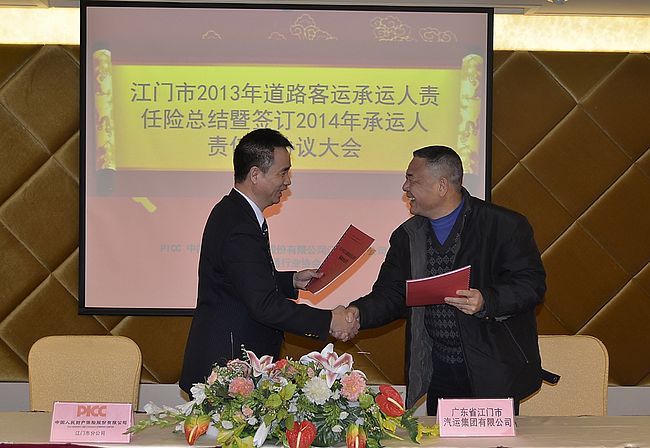 12月23日下午,江门市交通运输行业协会在江门市区举办2013年道路客运承运人责任险总结暨签订2014年协议会议,市交通运输行业协会副秘书长陈伟学主持。我公司领导及属下各汽车总站分管领导及安全员代表等参加会议,副总经理钟光明代表集团公司与中国人民财产保险股份有限公司江门分公司签订了《2014年道路客运承运人责任保险协议》。