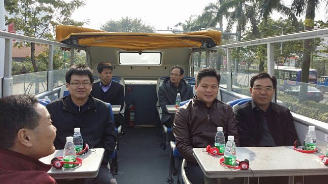 12月25日早上10时10分,市旅游局局长邵建(右二),市国企工委书记邹敦华(右一)、副书记黄峭云(左一)等一行在集团公司董事长、党委书记吕俊杰陪同下来到城轨江门站调研公汽公司双层旅游观光巴士运营情况,并登上观光巴士亲身体验。(江门公汽)