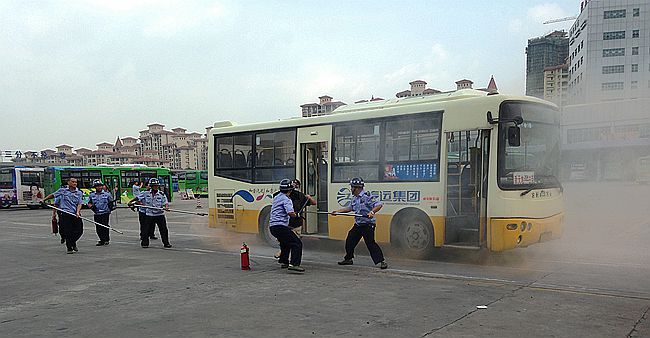当日下午3时所有参加演练人员在三楼车站会议室学习防恐/消防理论知识。下午4点,演练正式开始:鹤山汽车总站防恐、消防演练模拟该站公共汽车在正常运行过程中,有乘客向司机反映:“一名乘客精神有问题”,出于安全考虑,司机马上停车,疏散乘客,在疏散过程中,车辆尾部冒烟着火,疑有精神问题的乘客手拿利刀在驱赶车上乘客,司机立即拨打110、119报警及通知该站保卫部门,保卫部门接报后组织两队人员迅速赶到现场。一队防暴力治安组携带公安局下发的警用装备(盾牌、钢叉、丁字棍、钢盔、防割手套)赶到现场戒备,该疑有精神问题的乘客见保卫人员到场后挥刀乱砍,保卫人员熟练使用警用装备合力将其包围,并利用钢叉将其制服,警察到场后对其锁上手铐并带走。与此同时,另一队灭火组利用消防水带,手提灭火器成功将火扑灭。演练后半部分内容由每位员工分别用手提4KG干粉灭火器进行油桶实操灭火演练。