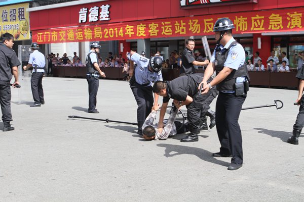 为了积极应对日趋严峻的防恐形势,提高客运站场对反恐怖袭击事件的应急处置能力,增强广大员工和旅客的防恐反恐意识,确保在发生恐怖事件时,把损失降到最低限度,6月26日上午,江门市交通运输局主办,集团公司、江门市蓬江区公安局巡警大队、五邑中医院等多个单位在江门汽车总站落客区联合举办江门市交通运输局2014年度客运站场反恐怖袭击应急演练。