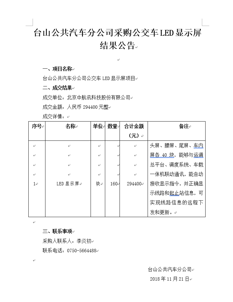 【台山公共汽车分公司采购公交车LED显示屏结果公告】